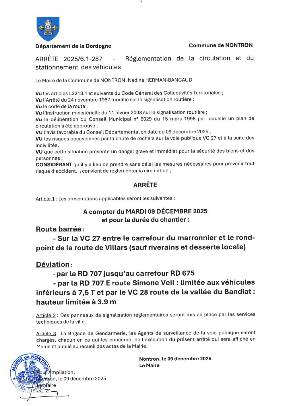 Une déviation est mise en place par la route de la Vallée du Bandiat, jusqu’à la fin des travaux estimés à la mi-février 2026.