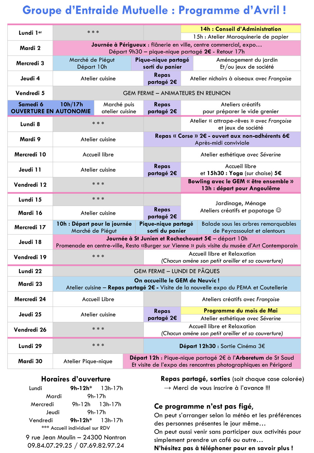Tél : 09 84 07 29 25 ou 07 69 82 97 24